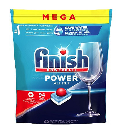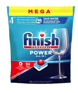 Finish Power All in 1 na každodenné použitie odmočí a zmäkčí zaschnuté škvrny od jedla. Čistý riad hneď na prvýkrát. Značka Finish je viazaná sľubom ochrany vodných zdrojov, a preto pracujú na minimalizácii ekologickej stopy, ktorú zanechajú produkty značky Finish a ich balenie, ktoré je recyklovateľné.