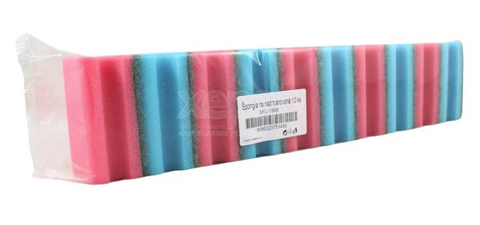 Špongia na umývanie riadu v strednej veľkosti a farebnom vyhotovní. Výborne absorbuje vodu a saponát a vytvára tak bohatú penu na umývanie riadu. Jej využitie nekončí pri umývaní riadu, nájde využitie aj pri každodennom upratovaní domácnosti. Veľkosť: 9 x 6 x 4 cm. Počet kusov v balení: 10 ks