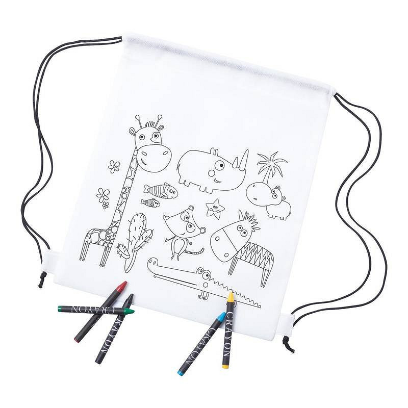 Detská vyfarbovacia taška so sťahovacou šnúrkou z netkanej textílie a 5 pastelkami.