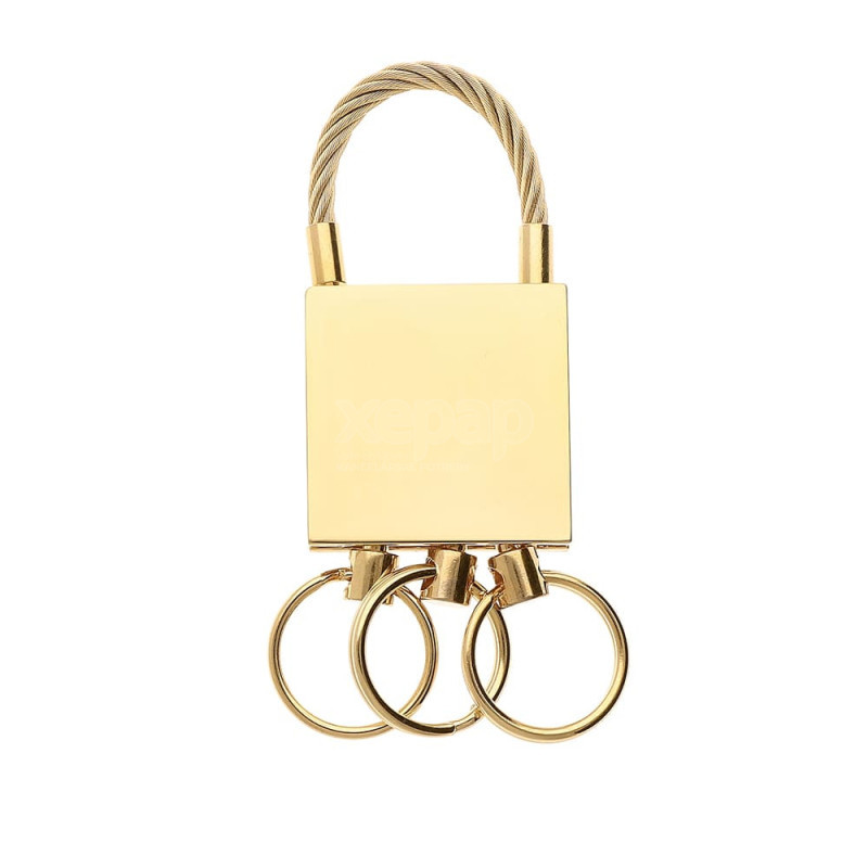 Pozlátená kovová kľúčenka so zámkom s lesklou povrchovou úpravou. Kľúčenka je vybavená tromi malými krúžkami na kľúče s priemerom 16 mm. Kombinácia elegantného designu s praktickým prevedením.