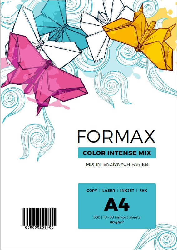 Farebný kopírovací papier Formax. Je určený do všetkých typov kopírovacích strojov, laserových a atramentových tlačiarní, pre obojstranné kopírovanie a tlač vo vysokorýchlostných kopírkach. Mix 10 intenzívnych farieb, z každej farby 50 hárkov.