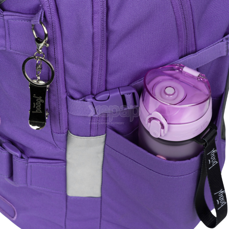 • Bočné vrecká, ideálne napríklad na tritanové fľaše BAAGL, sú vyrobené z pevného materiálu v rovnakom dizajne batohu.