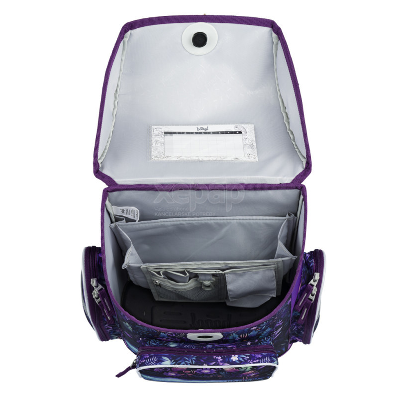 • Vnútri aktovky je priehľadná kapsa s rozvrhom a vnútorný organizér umožňujúci rovnomerné rozloženie hmotnosti.