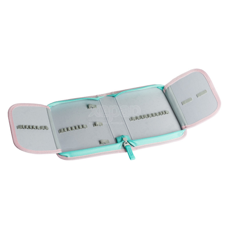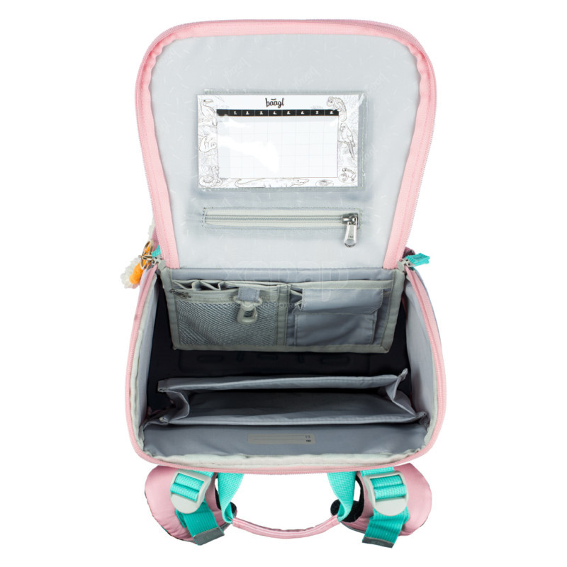 • Vo vnútri aktovky je priehľadná kapsička na rozvrh a vnútorný organizér umožňujúci rovnomerné rozloženie hmotnosti, doplnený gumičkou na fixáciu.